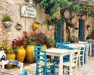 Venture to the far southeastern tip of Sicily, and you’ll discover Marzamemi, an ancient tuna-fishing village that has been subtly transformed into one of Italy's chicest coastal hideaways. Its heart is the stunning Piazza Regina Margherita, framed by ancient golden-stone buildings, iconic blue chairs, and a riot of colorful bougainvillea.